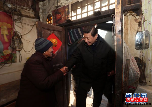 2012年12月29日至30日,中共中央總書記、中央軍委主席習近平在河北省阜平縣看望慰問困難群眾。這是習近平在龍泉關鎮(zhèn)駱駝灣村到困難群眾唐榮斌家看望。新華社記者蘭紅光攝