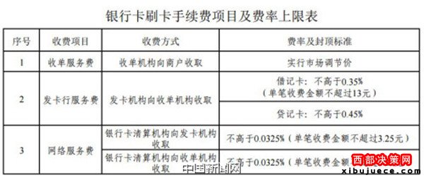 其中,發(fā)卡機(jī)構(gòu)收取的發(fā)卡行服務(wù)費(fèi)將改為不區(qū)分商戶類別,實(shí)行政府指導(dǎo)價(jià)、上限管理,并對(duì)借記卡、貸記卡差別計(jì)費(fèi)。發(fā)卡行服務(wù)費(fèi)費(fèi)率水平降低為借記卡交易不超過(guò)交易金額的0.35%,貸記卡交易不超過(guò)0.45%。借記卡交易單筆收費(fèi)金額不超過(guò)13元,貸記卡交易不實(shí)行單筆收費(fèi)封頂控制。
