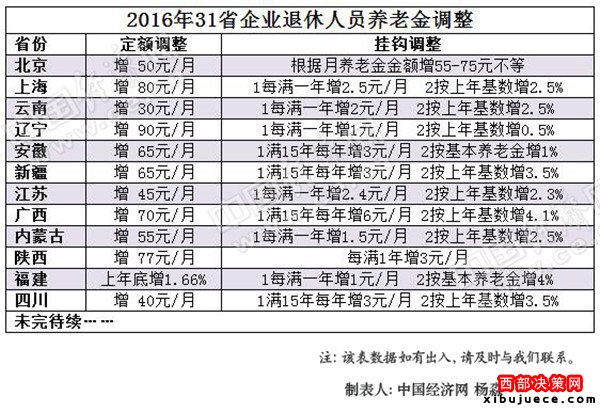 近日,隨著江蘇、安徽、廣西省退休人員基本養(yǎng)老金調整方案出臺,中國經濟網記者統(tǒng)計了31個省市養(yǎng)老金調整情況,據(jù)不完全統(tǒng)計,目前至少有12個省份公布上調養(yǎng)老金,同時又很多地區(qū)的養(yǎng)老金總體水平超過6.5%。
