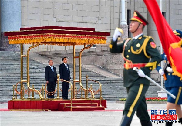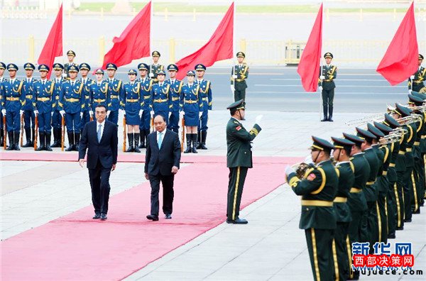 會(huì)談前,李克強(qiáng)在人民大會(huì)堂東門外廣場為阮春福舉行歡迎儀式。