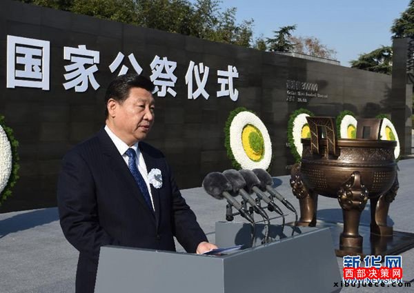 2014年12月13日上午,中共中央、全國人大常委會、國務(wù)院、全國政協(xié)、中央軍委在南京隆重舉行南京大屠殺死難者國家公祭儀式。中共中央總書記、國家主席、中央軍委主席習(xí)近平出席并發(fā)表重要講話。