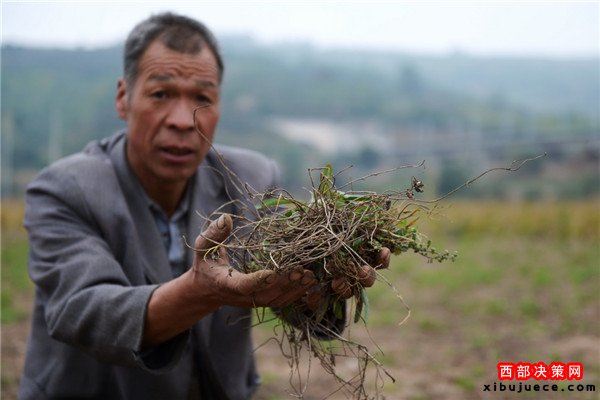 9月28日,定西市渭源縣清源鎮(zhèn)崔家河村,一位農(nóng)民展示從地里挖出來(lái)的已經(jīng)旱死的黨參。