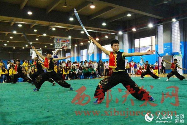 10月22日,云南師范大學體育學院的學生們手持單刀、木棍、長槍等,為參加第九屆“漢語橋”世界中學生中文比賽的海外選手表演了精彩的中華傳統(tǒng)武術。一些參賽選手也摩拳擦掌,登臺獻藝,與云南師范大學的學生們互相切磋,引得現(xiàn)場一片喝彩。