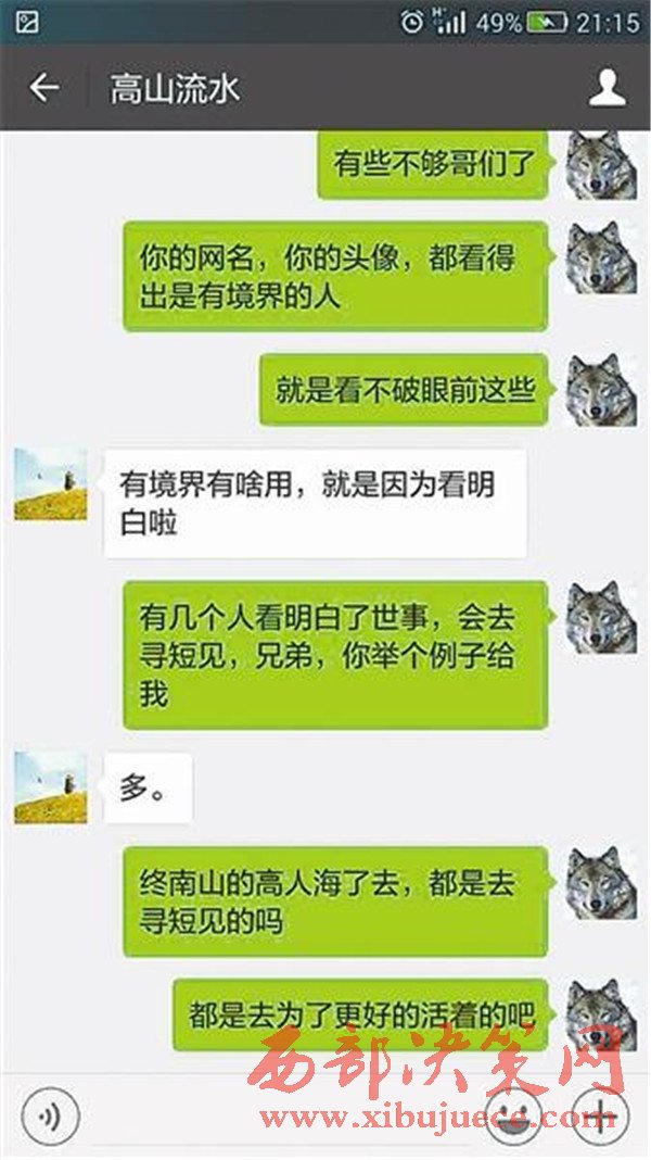 40歲的王先生居住在陜西,他與徐超原本并不相識。幾天前,王先生在貼吧發(fā)出一條交友的帖子,而后與網(wǎng)名為“他的眼淚在流淌”的徐超成為了微信好友。交流不久后,徐超突然表現(xiàn)出了輕生的念頭。在交流中,徐超接連表示“受苦太多想死”、“跳樓算了”……徐超說,自己“命不好”,事業(yè)和愛情都沒有,已經(jīng)“堅(jiān)持不了了”。