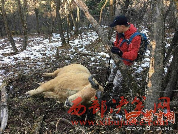 11月13日,西安市民米女士與朋友一起到秦嶺爬山,當(dāng)日上午10時許,她們走到小王澗保護區(qū)附近,發(fā)現(xiàn)一頭被人下套勒死的羚牛。由于當(dāng)時山上沒有信號,米女士和朋友沒能立即報警,他們也沒有破壞現(xiàn)場,只拍了幾張照片便離開了。根據(jù)米女士提供的照片看,一頭羚牛脖子上勒著一根鋼絲躺在地上,它身下一片狼藉,像是掙扎所造成的。