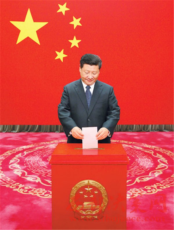 上午10時許,習(xí)近平來到懷仁堂投票站,同投票站的工作人員親切握手,仔細(xì)聽取有關(guān)選舉事項的說明。習(xí)近平拿出選民證交給工作人員核驗,并領(lǐng)取了一張選票。在寫票處認(rèn)真填寫選票后,習(xí)近平走到票箱前鄭重投下自己的一票。