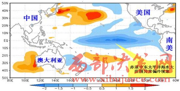 拉尼娜事件發(fā)生時(shí)海水表面溫度距平分布示意圖。(紅色表示偏暖,藍(lán)色表示偏冷,顏色越深表示偏暖或偏冷程度越強(qiáng))