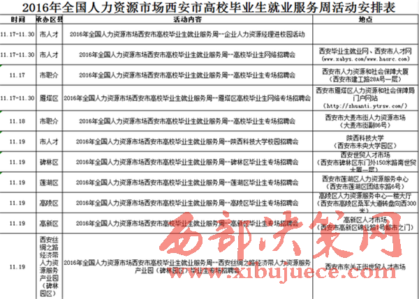 11月17日—11月30日,西安市將舉行2016年全國人力資源市場西安市高校畢業(yè)生就業(yè)服務周。期間將舉辦高校畢業(yè)生網絡招聘大會、現(xiàn)場招聘會、人力資源服務產業(yè)園專場招聘活動等29場招聘會,幫助高校畢業(yè)生找到滿意工作。