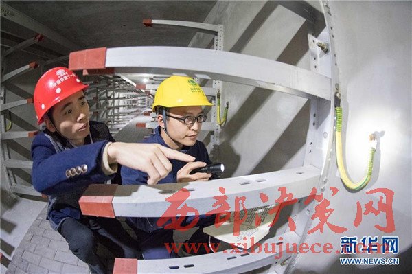 11月24日,解放碑地下環(huán)形電力隧道的一段支線電力隧道內(nèi),兩名國網(wǎng)重慶市區(qū)供電公司的技術(shù)人員(右一、右二)在對預(yù)留的商業(yè)用戶接入隧道的電力設(shè)施設(shè)備進(jìn)行竣工驗收。當(dāng)日,經(jīng)過3年多的緊張建設(shè),重慶地下環(huán)形“電力高速路”——解放碑地下環(huán)形電力隧道工程順利通過竣工驗收,并正式投入運行。解放碑環(huán)形電力隧道總長2408米,其中1198米的干線電力隧道已經(jīng)成功接入解放碑商圈及周邊地區(qū)的4個110千伏變電站形成環(huán)線,支線電力隧道1210米也開始陸續(xù)接入用戶。據(jù)介紹,作為重慶市重點工程,2013年7月開工建設(shè)的解放碑地下環(huán)形電力隧道按照滿足未來20年電力需求設(shè)計,隧道高2.8米、寬2.4米,投入運行后將解決重慶渝中半島和重慶最繁華的解放碑商業(yè)區(qū)配電設(shè)施老化、無法擴建等問題,使解放碑商圈供電負(fù)荷承載能力得到極大加強。