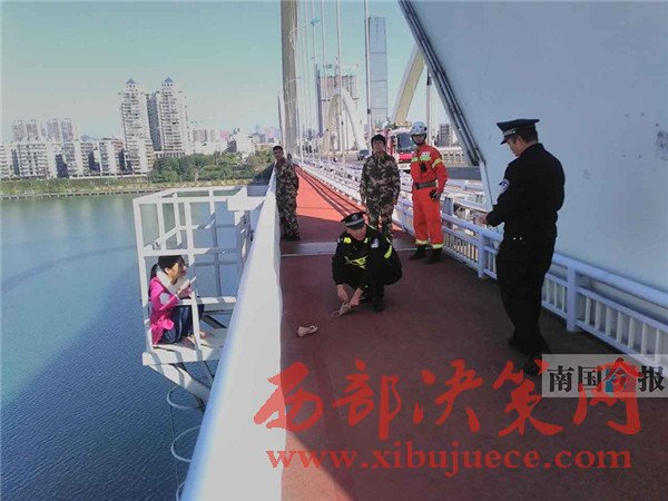 27日下午,柳州市廣雅大橋中段,有一名女子因感情問題想不開,翻越護(hù)欄想要輕生,民警和消防官兵趕到現(xiàn)場(chǎng),經(jīng)過2個(gè)多小時(shí)的努力,終于抓住機(jī)會(huì)將其救下。