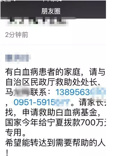 3日開始,該微信在多個(gè)朋友圈中刷屏,還公布了工作人員的手機(jī),當(dāng)天,多個(gè)網(wǎng)友撥打該手機(jī)申請或詢問是否能申請救助白血病基金。“剛開始還一頭霧水,后來看到了同事轉(zhuǎn)發(fā)給我的朋友圈截圖,才明白過來。”