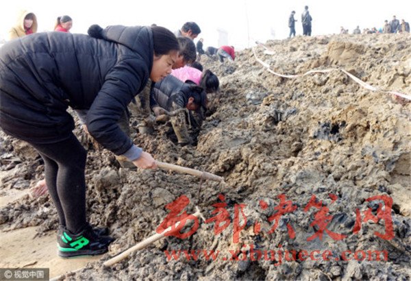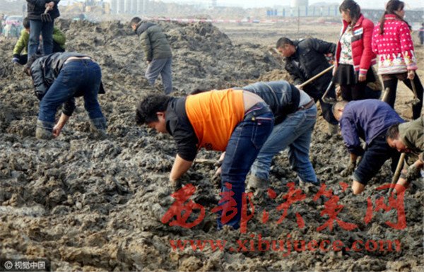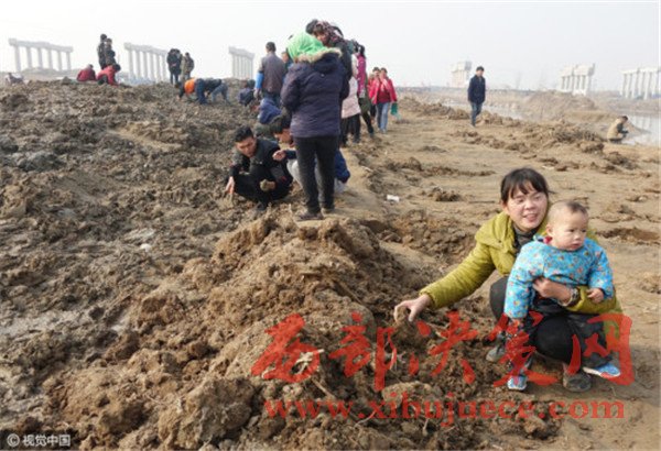 12月1日上午,記者在現(xiàn)場看到,幾十米寬的賈魯河兩岸,聚集了近百名村民,坑坑洼洼河灘上都是淤泥。村民們穿著膠鞋把淤泥抓在手里,尋找著里面的“寶貝”。