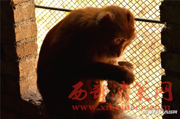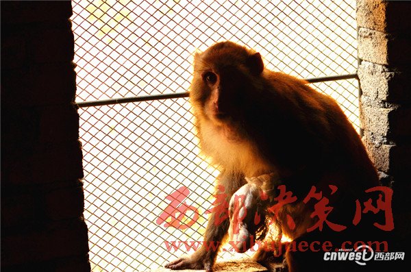 2016年12月8日,左前臂手術后的獼猴跳到寧強縣野生動物救助中心的窗戶上警惕地看著工作人員。
