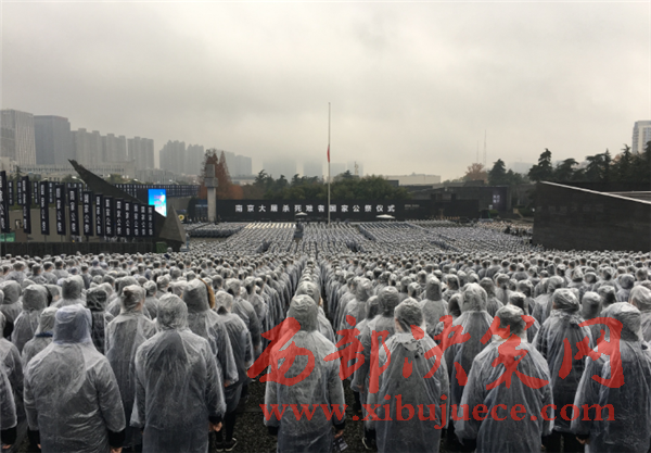 12月13日,十時整,雨中,南京大屠殺死難者國家公祭儀式在南京大屠殺遇難同胞紀(jì)念館隆重舉行。8000人冒雨參加了公祭,向30萬遇難同胞致哀,場面莊嚴(yán)肅穆。國家公祭儀式從上午10點正式開始,南京全城鳴笛致哀。