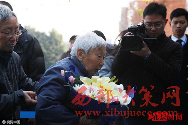 12月9日,江蘇省南京市,南京大屠殺幸存者楊翠英老人向罹難親人敬獻鮮花。