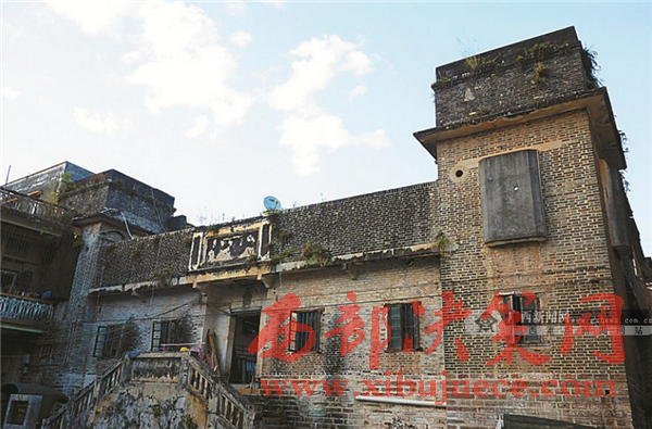 在教育路第一小學(xué)對(duì)面一座大院里,果然立著一棟形如圍屋的方形磚樓,氣派的門樓,圍墻四角高聳的碉樓,均顯示著主人當(dāng)年顯赫的身世。