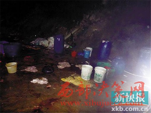 在查獲現(xiàn)場(chǎng),違法人員臨時(shí)搭建的私宰帳篷里,地上鋪滿了豬血和豬毛的混合物,生豬糞便隨著水流漸漸形成一條“小河”流向遠(yuǎn)處,殺豬刀、鐵鉤、鐵叉等用于私宰的工具隨意擺放在地上,與豬毛、豬血、糞便等混合在一起?,F(xiàn)場(chǎng)一口直徑近2米的大鍋盛滿了水,熱氣騰騰。