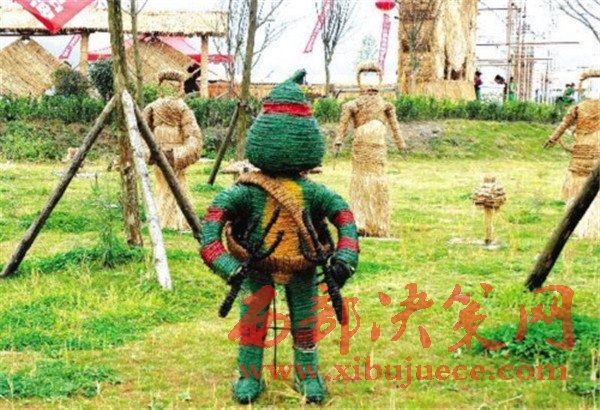 (稻雕人雙手拿著魚(yú)叉。)
