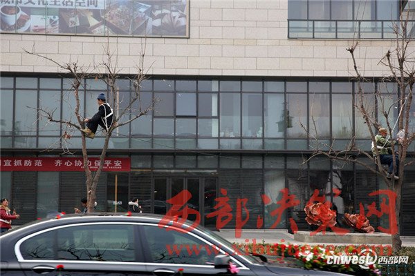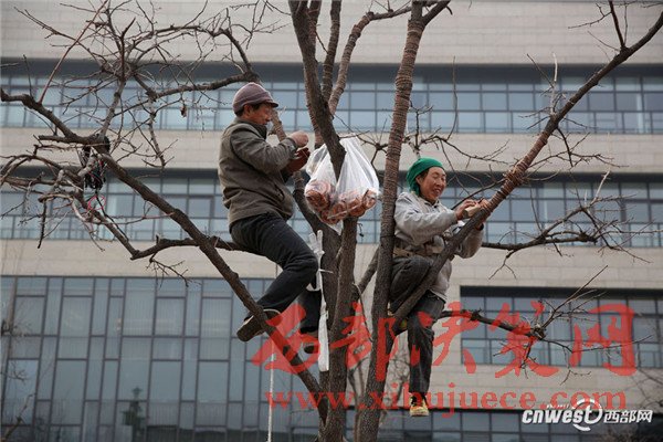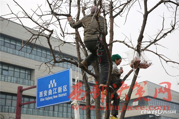 12月24日,西安市曲江新區(qū)芙蓉南路、雁塔南路,不少工人爬到樹上綁彩燈。一名正在樹上往樹枝上一圈一圈纏繞彩燈的師傅說:“綁一棵樹的彩燈一人得花半天到一天時間。”
