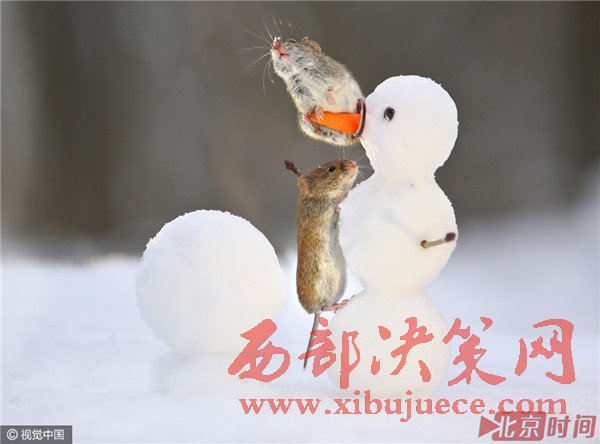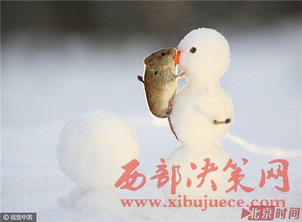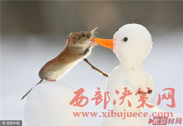 田鼠爬到小雪人身上,吃掉雪人“鼻子”萌翻了
