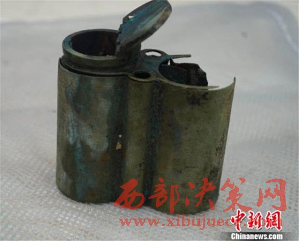 圖為“呂義泰白銅壽紋水煙袋”,缺水斗、吸管。外筒上下口沿云雷紋,中腹團壽紋。煙倉內蓋上刻有“漢鎮(zhèn)呂義泰劉盛”字樣。寬8.8,殘高8.8 ,單筒徑4.1厘米。“丹東一號”水下考古隊供圖