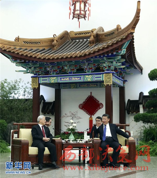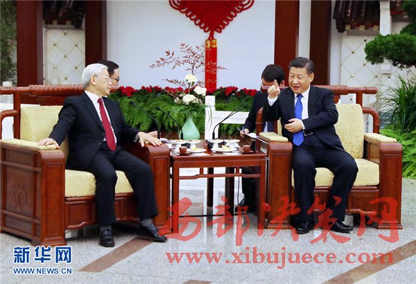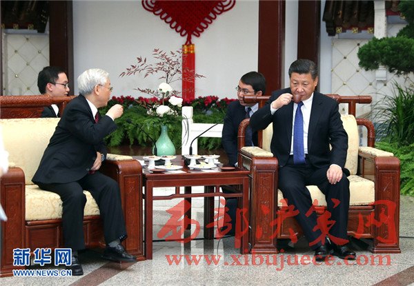 1月12日,中共中央總書記、國家主席習近平在北京人民大會堂同越共中央總書記阮富仲舉行會談。這是會談后,兩黨總書記進行茶敘。