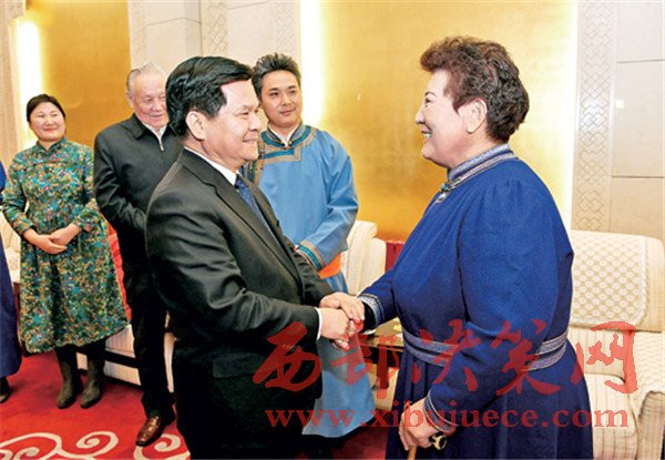 1月16日晚,自治區(qū)黨委書記李紀(jì)恒在觀看大型蒙古族歌劇《愛(ài)在胡楊》演出前,接見(jiàn)了總策劃德德瑪?shù)染巹?chuàng)人員。