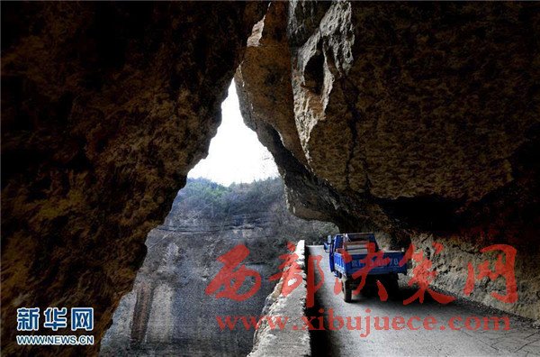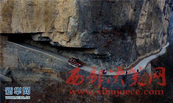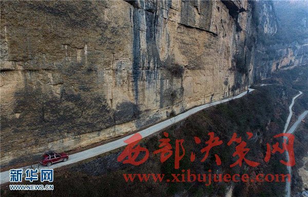 1月16日,一輛農(nóng)用車行駛在西方溝村的掛壁公路上。
