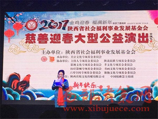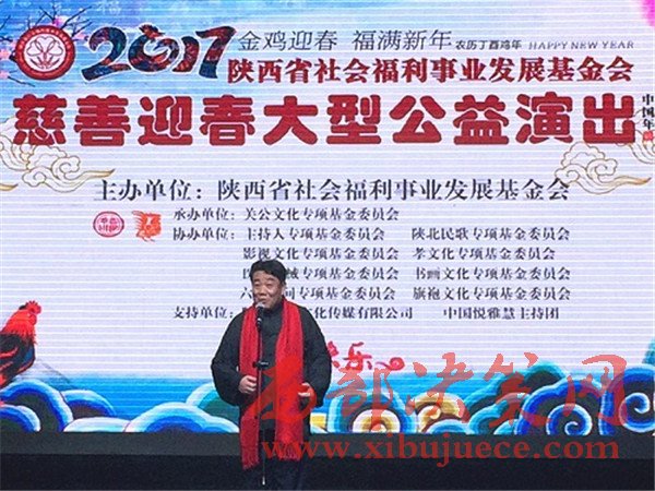 1月18日晚,由陜西省社會(huì)福利事業(yè)發(fā)展基金會(huì)主辦、關(guān)公文化專項(xiàng)基金委員會(huì)承辦、主持人專項(xiàng)基金委員會(huì)、陜北民歌專項(xiàng)基金委員會(huì)等協(xié)辦、陜西省民政廳指導(dǎo)的《慈善迎春》大型公益演出在蓮湖區(qū)絲路藝術(shù)劇院成功舉辦。