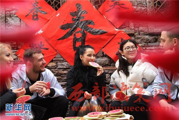 2月3日,在山東省臨沂市沂南縣竹泉村,來(lái)自俄羅斯的游客瑪麗婭(中)與同伴在開辦農(nóng)家樂(lè)的村民肖蕊(右二)家中吃生蘿卜,體驗(yàn)“咬春”。