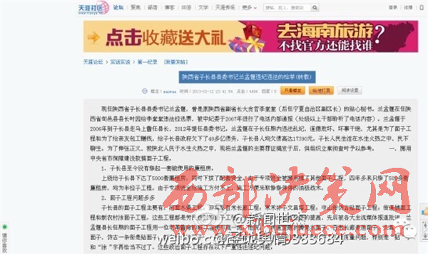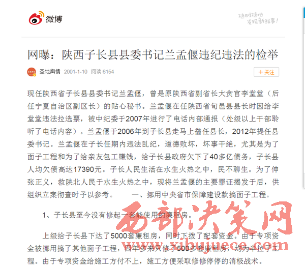 據(jù)微博網友爆料:現(xiàn)任陜西省子長縣縣委書記蘭孟偃,曾是原陜西省副省長大貪官李堂堂(后任寧夏自治區(qū)副區(qū)長)的貼心秘書。蘭孟偃在任陜西省旬邑縣縣長時因給李堂堂違法拉選票,被中紀委于2007年進行了電話內部通報(處級以上干部聆聽了電話內容)。蘭孟偃于2006年到子長縣走馬上齤任縣長,2012年提任縣委書記。蘭孟偃在子長任期內違法亂紀,道德敗壞,壞事干絕,尤其是為了面子工程和為了給親友包工賺錢,給子長縣政府欠下了40多億債務,子長縣人均欠債高達17390元。子長人民生活在水生火熱之中,民不聊生。為了伸張正義,救陜北人民于水生火熱之中,現(xiàn)將蘭孟偃的主要罪證揭發(fā)于后,供組織立案徹查時予以參考?! ∫弧⑴灿弥醒胧∈斜U辖ㄔO款搞面子工程。