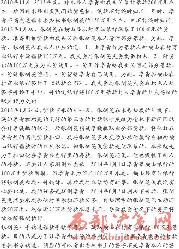 網(wǎng)友微信公眾號(hào) 江嶼濯浪爆料 2010年11月-2012年底,神木縣人李青向我岳父累計(jì)借款260萬(wàn)元左右。后因神木縣出現(xiàn)民間借貸危機(jī),該款不能按時(shí)歸還。同時(shí),李青還高利息借市委辦秘書(shū)張劍英的130萬(wàn)元左右,也不能按時(shí)歸還。2013年1月初,張劍英在橫山縣農(nóng)村商業(yè)銀行聯(lián)系了100萬(wàn)元的貸款,準(zhǔn)備用該貸款向我岳父和張劍英本人清償部分借款。為此,李青、張劍英和我三人口頭約定:1、由李青作為借款人向橫山農(nóng)村商業(yè)銀行申請(qǐng)借款100萬(wàn)元,我夫妻與張劍英夫妻提供擔(dān)保;2、所貸出的100萬(wàn)元分為三份使用,一份用作李青給我岳父償還部分借款、一份給張劍英償還,一份留給李青自己使用。為此,李青和橫山農(nóng)村商業(yè)銀行簽訂了《借款合同》,我夫妻與張劍英夫妻在擔(dān)保人處簽字并按了手印,并約定銀行將100萬(wàn)元借款打入李青的姐夫高斌的賬戶(hù)視為交付。