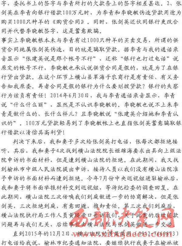 判決下來(lái)后,我和妻子多次給張劍英打電話(huà),張每次都拒絕接聽(tīng),其后,我和妻子4次找到橫山法院院長(zhǎng)姬雄海要求出具向上級(jí)法院申訴的書(shū)面材料,但是遭到橫山法院的拒絕。在此期間,我又找到榆林市中級(jí)人民法院提出申訴,接待人員以我們沒(méi)有橫山法院準(zhǔn)予申訴的書(shū)面材料而遭到拒絕。今年7月份中央巡視組進(jìn)駐榆林后,我和妻子將書(shū)面舉報(bào)材料交到巡視組,等待紀(jì)檢委的調(diào)查回復(fù)。在此期間,橫山法院三次傳喚我們到庭做進(jìn)一步的協(xié)商解決,但是張劍英,三次拒絕到庭,有意回避,推卸責(zé)任。第三次我們到庭后,橫山法院執(zhí)行局工作人員黃騰親口告訴我們,關(guān)于此案的后續(xù)還款問(wèn)題再與我們無(wú)關(guān),后續(xù)事宜由橫山法院與張劍英做進(jìn)一步交涉。