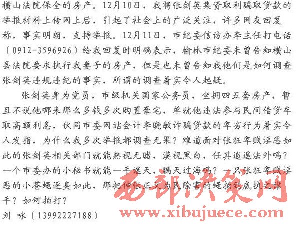 直到2015年的12月2日,橫山法院的羅某某用(0912-7660873)打電話(huà)給我說(shuō),榆林市紀(jì)委通知法院,要繼續(xù)執(zhí)行我妻子在榆林被橫山法院保全的房產(chǎn)。12月10日,我將張劍英集資取利騙取貸款的舉報(bào)材料上傳網(wǎng)上后,引起了社會(huì)上的廣泛關(guān)注,許多網(wǎng)友回復(fù)稱(chēng),事實(shí)明朗,支持舉報(bào)。12月11日,市紀(jì)委信訪(fǎng)辦李主任打電話(huà)(0912-3596926)給我回復(fù)時(shí)明確表示,榆林市紀(jì)委未曾告知橫山縣法院要求執(zhí)行我妻子的房產(chǎn),但是也未曾告知我他們是如何調(diào)查張劍英違規(guī)違紀(jì)的事實(shí),所謂的調(diào)查著實(shí)令人起疑。
