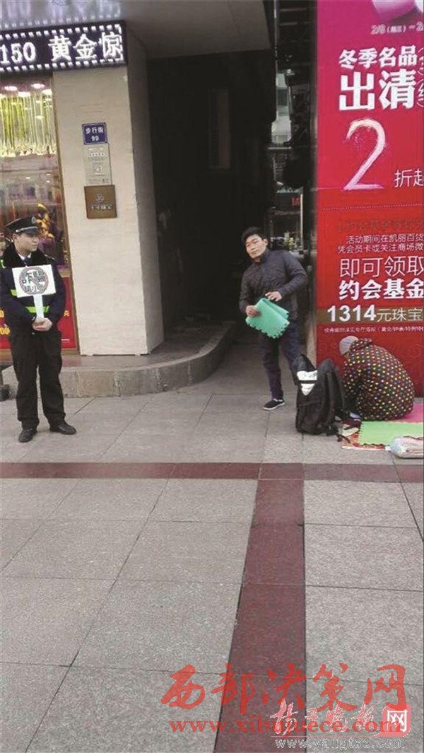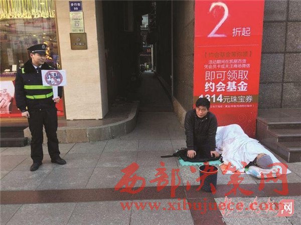 元宵節(jié)當(dāng)天,張家港沙洲路步行街一商場樓下,一名年輕男子以母親患重病為由跪地乞討,"母親"就躺在地上,旁邊站著一名城管協(xié)管員,舉起了寫著"詐騙請小心"的牌子。被攪了局的"行乞者"最后只能逃之夭夭。據(jù)當(dāng)事城管協(xié)管員介紹,乞討男子是個"熟面孔",當(dāng)天曾躲進小弄堂里抽煙打電話,用的是蘋果手機,抽的是中華煙,這讓他們更加確信,男子是職業(yè)行乞,根本不是家中有困難。揚子晚報全媒體記者於蘇云