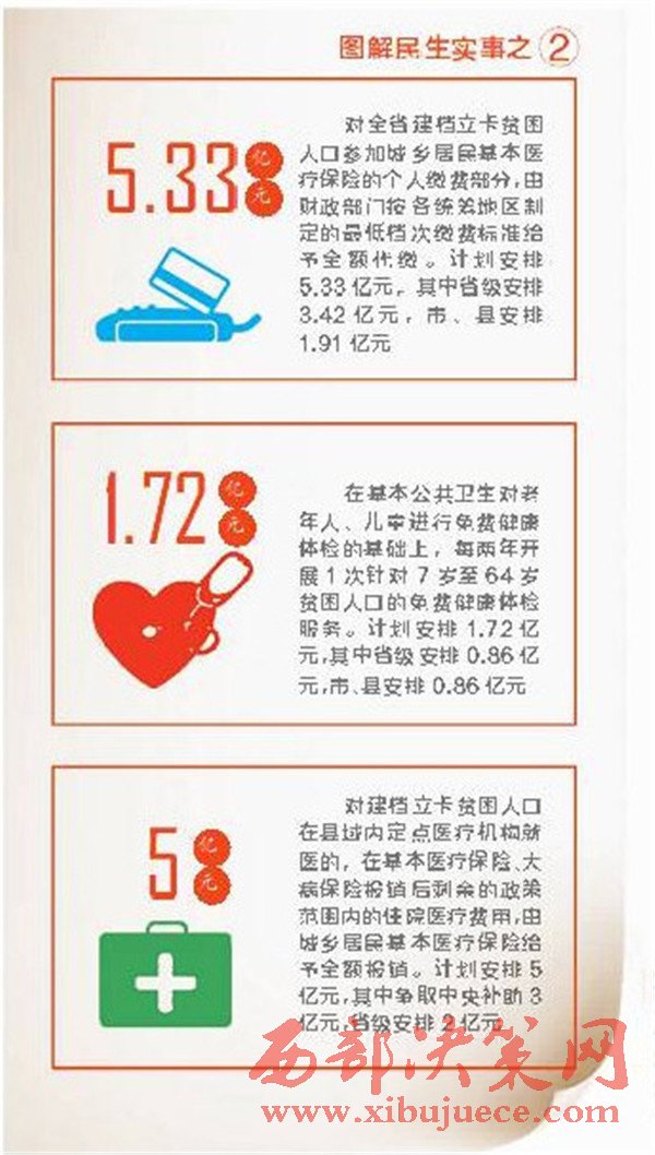 對(duì)建檔立卡貧困人口在縣域內(nèi)定點(diǎn)醫(yī)療機(jī)構(gòu)就醫(yī)的,在基本醫(yī)療保險(xiǎn)、大病保險(xiǎn)報(bào)銷(xiāo)后剩余的政策范圍內(nèi)的住院醫(yī)療費(fèi)用,由城鄉(xiāng)居民基本醫(yī)療保險(xiǎn)給予全額報(bào)銷(xiāo)。計(jì)劃安排5億元,其中爭(zhēng)取中央補(bǔ)助3億元,省級(jí)安排2億元