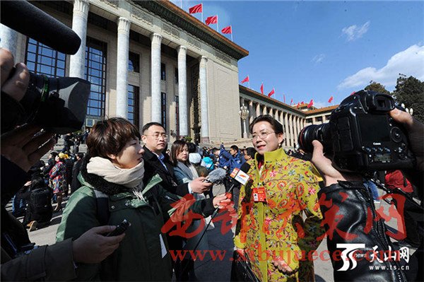 3月5日,新疆全國人大代表古麗努爾·買買提在北京人民大會堂前接受媒體采訪。
