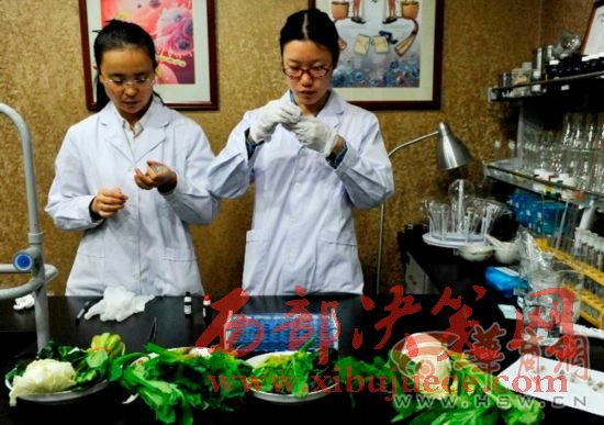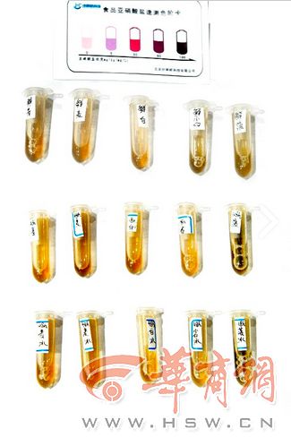 華商報記者在市場上購買了新鮮的菠菜,白菜,小白菜,油麥菜,青菜,拿到西安營養(yǎng)學(xué)會,專家通過實(shí)驗(yàn)的方法,檢測新鮮蔬菜、冰箱存放48小時的蔬菜、常溫存放48小時的蔬菜中亞硝酸鹽含量的變化。