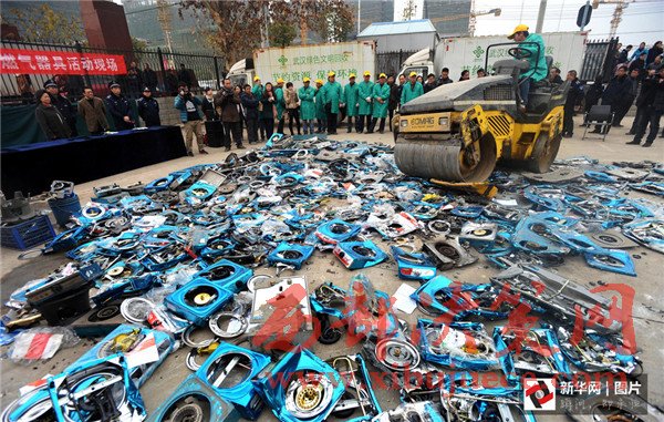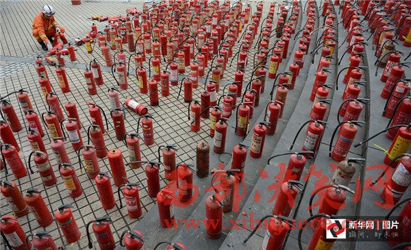 2012年11月6日,四川省成都市,一批假冒偽劣的消防滅火器被銷毀。當日,四川省“119”消防宣傳周啟動暨消防產品形式安檢公開處理假冒偽劣消防器材產品集中銷毀儀式在成都舉行。