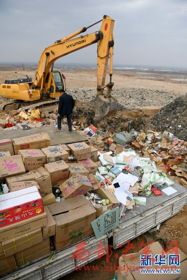 3月14日,在寧夏寧東垃圾填埋場,工作人員將假冒偽劣商品進行填埋處理。“3·15”國際消費者權益日即將到來之際,銀川市市場監(jiān)督管理局集中展示并銷毀食品、藥品、電器等32個類別的假冒偽劣商品。