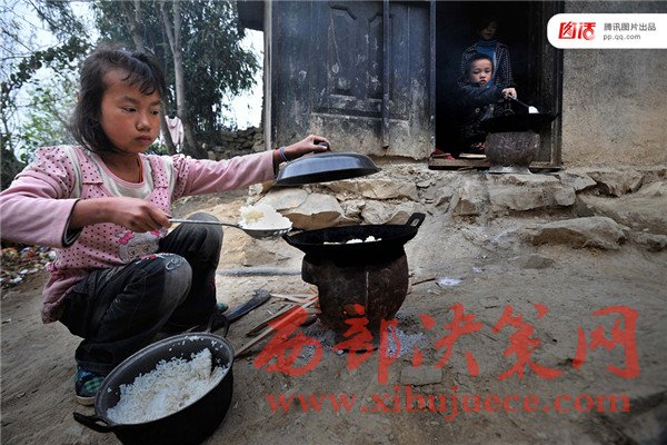 圖為2011年3月31日,在貴州羅甸縣班仁鄉(xiāng),學生在每學期開學的時候,除了背書包去上學以外,還要帶著爐灶和鍋碗瓢盆等。包括一年級學生在內,在學校他們每天必須自己生火做飯。
