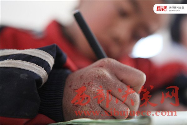 圖為2011年12月28日,山西省長治市沁縣池堡寄宿小學,一名手凍裂口的小學生在寒冷的教室內寫作業(yè)。