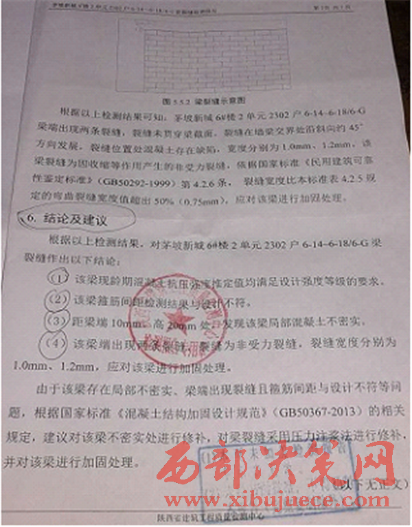 最早有兩戶村民投訴舉報(bào),小區(qū)的物業(yè)公司出資委托陜西省建筑工程質(zhì)量檢測中心進(jìn)行鑒定,結(jié)論如下: