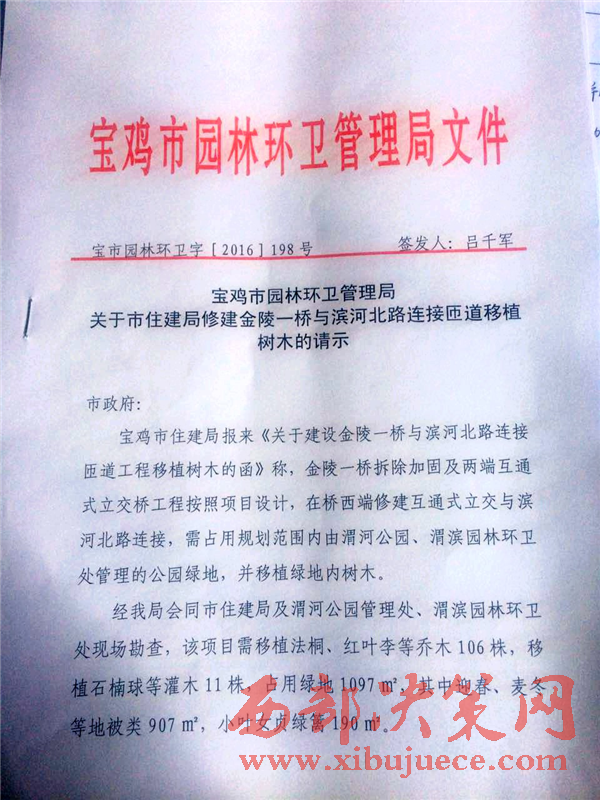 2月23日,本網(wǎng)工作人員來到了寶雞市園林環(huán)衛(wèi)管理局了解情況,綠化科張女士拿出了寶雞市園林環(huán)衛(wèi)局2016年11月30日上報寶雞市人民政府‘寶市園林環(huán)衛(wèi)字【2016】198號文件‘,內容是“關于市住建局修建金陵一橋與濱河北路連接匝道移植樹木“的請示報告。報告顯示項目需要移植法桐、紅葉李、喬木等106株,移植石楠球等灌木11株。但該報告未顯示需要砍伐樹木。