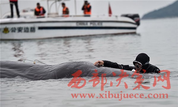 3月14日,在惠州港油庫(kù)碼頭附近海域,潛水員在抹香鯨身上安裝儀器對(duì)其進(jìn)行聽(tīng)覺(jué)測(cè)試,判斷其健康狀況。