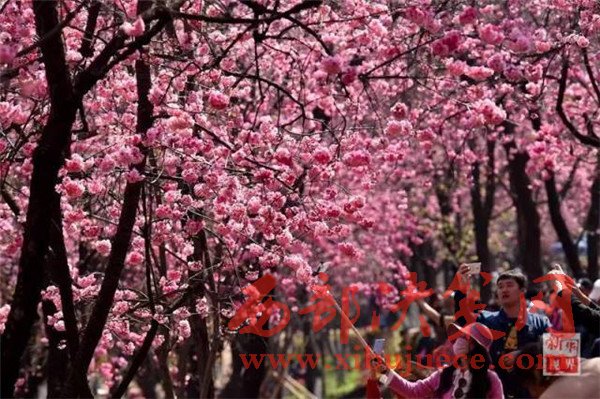 游人在昆明圓通山公園拍攝盛開的櫻花。