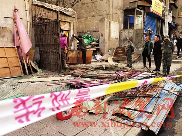 昨日下午5時許,記者在北火巷小區(qū)南口看到,數(shù)名工人正在對沿街違章建筑進行拆除。小區(qū)11號樓一沿街人行道上,拉起有數(shù)十米長的警戒線,警戒線內被拆下的防盜網(wǎng)招牌等雜物堆積在一旁等待處理。據(jù)小區(qū)住戶說,該區(qū)域被個別經(jīng)營戶長期“占領”擺攤經(jīng)營的現(xiàn)象終于得到了改善。