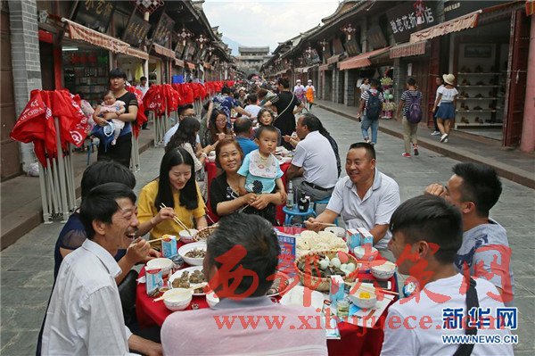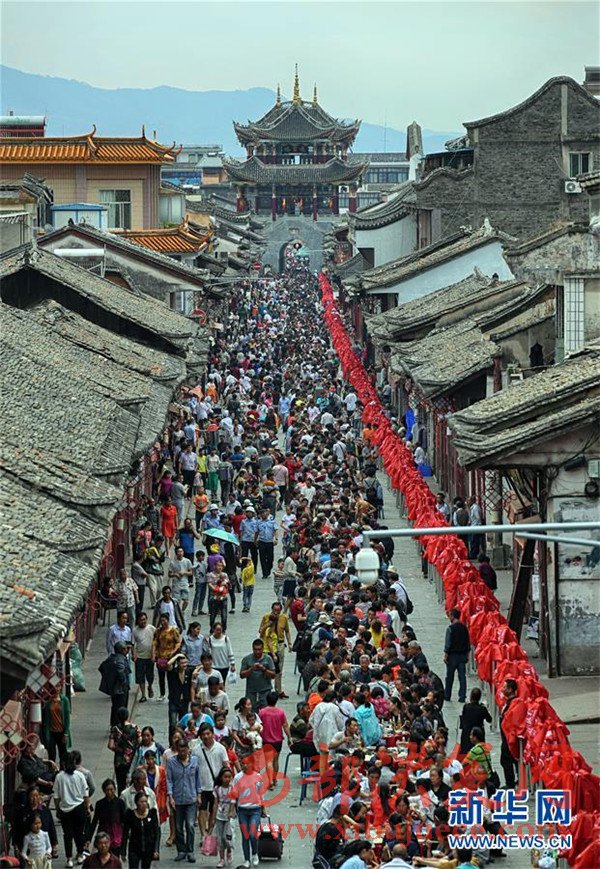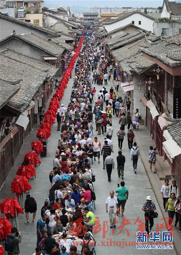當(dāng)日是端午節(jié),四川省涼山彝族自治州會理縣會理古城舉行“萬人藥根宴”,約1.5萬人共同在古城內(nèi)1500張桌上就餐。
