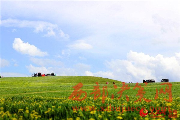 5月29日,游客在新疆裕民縣巴爾魯克山風(fēng)景區(qū)阿克喬克草原踏青賞花。