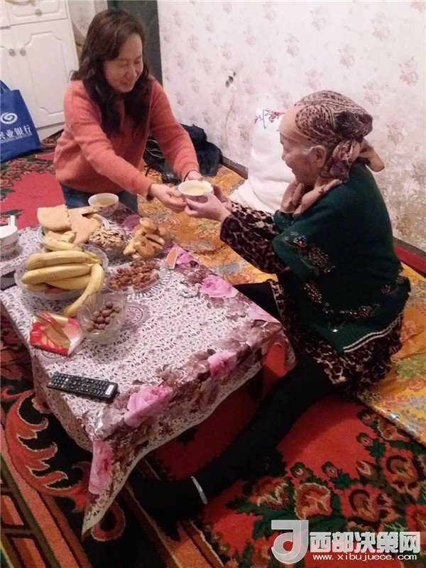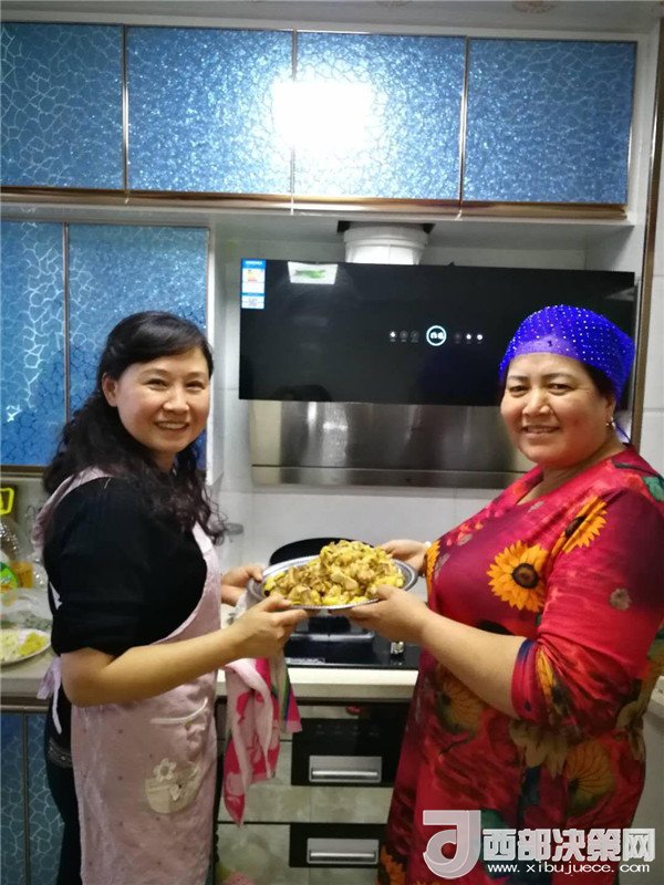 艾來(lái)提·賽買提的父親賽買提·阿合買提一面接過(guò)韓莉書記手里的米、面、清油和兩大兜食材,一面心疼地埋怨:“這么冷的天,你們又拿這么多東西,多辛苦,你上次送來(lái)的東西還沒(méi)有吃完呢。”韓莉和王艷萍笑而不語(yǔ),心里默默地盤算著帶給親戚意外的驚喜。因?yàn)榘瑏?lái)提·賽買提和愛(ài)人長(zhǎng)期兩地分居,聚少離多。今天正好是他們父母結(jié)婚三十周年紀(jì)念日,她們?nèi)嗽缇蜕塘亢靡欢ㄒH手做一頓飯,邀請(qǐng)這個(gè)民族團(tuán)結(jié)大院里附近的同事和各自的親戚一起來(lái)給這個(gè)小家庭舉辦一場(chǎng)別開(kāi)生面的大融合聚會(huì),她們忙碌著,擇、洗、炒,撲鼻的香味彌漫在親戚的家中……
